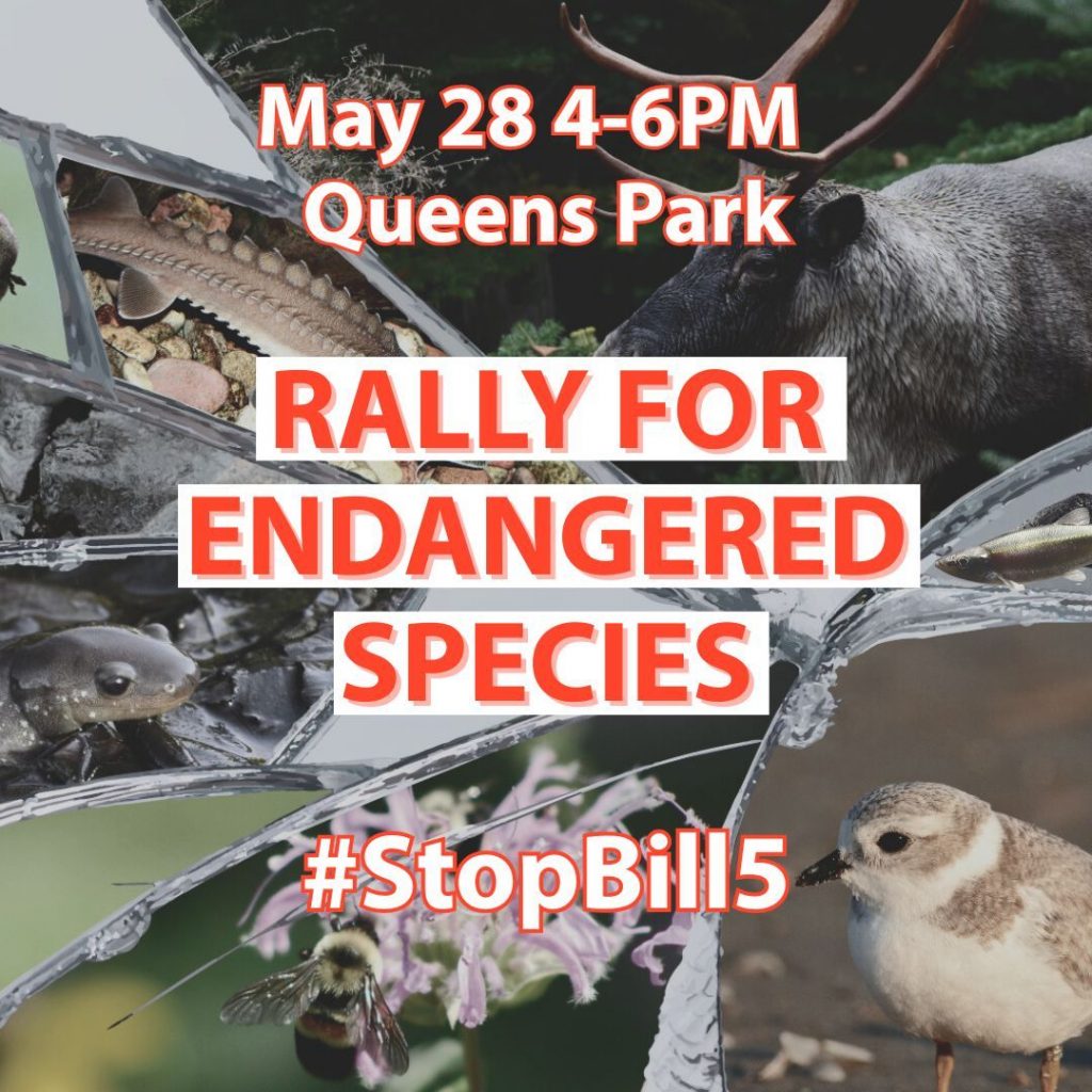 The Ford government’s latest attempted land-grab–Bill 5– proposes to repeal Ontario’s Endangered Species Act and utterly abandon the province’s commitment to protecting wildlife and their habitats, sacrificing them on the alter of corporate profits and hand-outs to big developers, all in the middle of a biodiversity crisis.